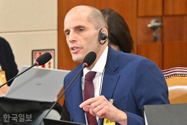 해럴드 로저스 쿠팡 임시대표가 30일 서울 여의도 국회에서 열린 쿠팡 연석 청문회에 출석해 의원 질의에 답하고 있다. 민경석 기자 |