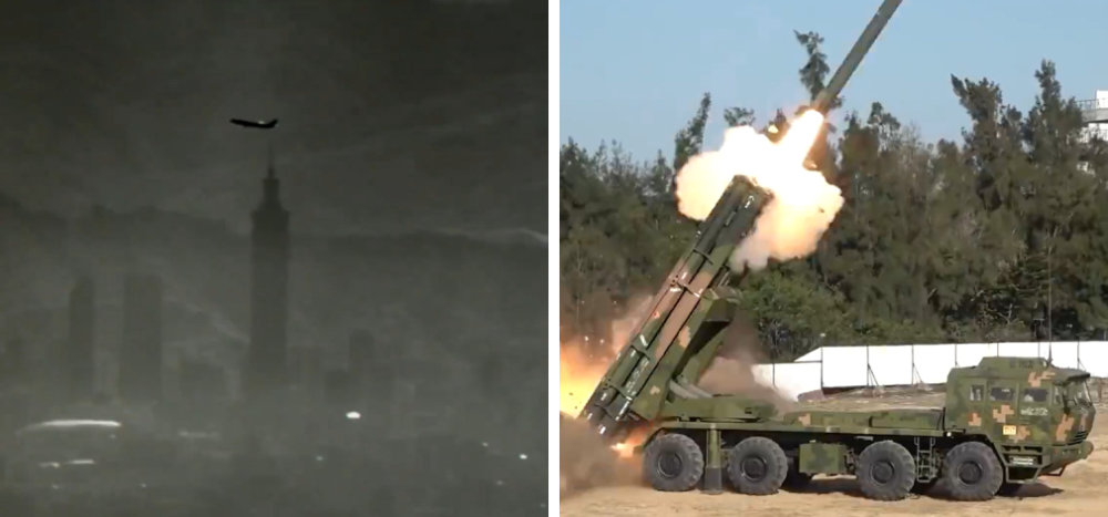 29일 중국군이 드론으로 촬영해 공개한 대만 타이베이의 초고층 건물 ‘타이베이101’ 영상(왼쪽 사진). 다음 날 공개한 영상에선 중국 육군 부대가 대만섬 북부 해역을 겨냥해 장거리 실탄 사격 훈련에 참가하는 모습이 담겼다. 중국은 이틀째 ‘대만 포위’ 군사 훈련을 하면서 관련 영상을 온라인에 공개해 압박 수위를 높이고 있다. 사진 출처 X |