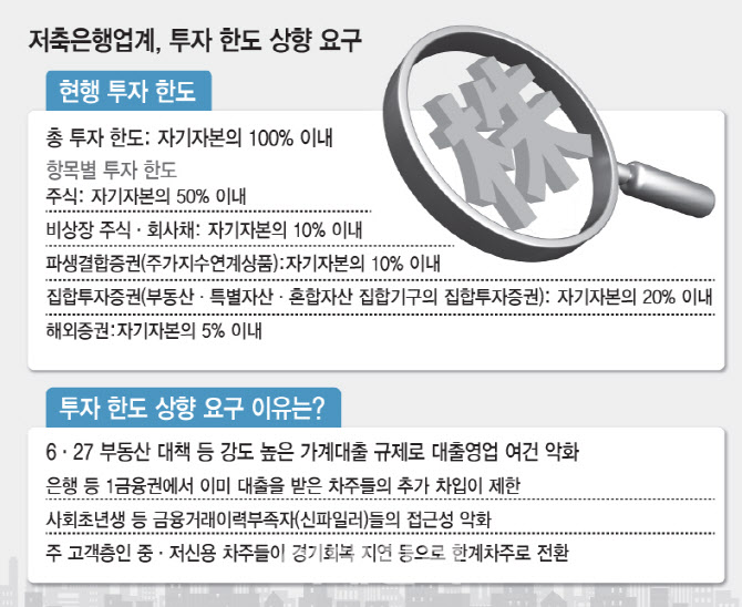 [이데일리 김형일 기자] 저축은행업계가 유가증권 투자 한도 상향을 요구하고 나섰다. 정부의 강도 높은 가계대출 규제로 2금융권 대출 영업이 크게 위축된 만큼, 자본적정성이 확보된 저축은행에 한해 규제를 완화해 달라는 것이다. 저축은행은 한도가 없는 타 금융업권과 달리, 서민금융기관이라는 업권 특성과 금융 안정성을 고려해 유가증권 투자에 별도의 제한이 적용되고 있다.