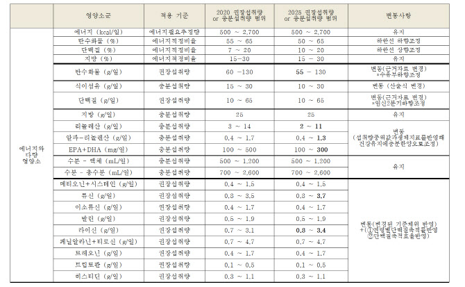그 외 식이섬유, 비타민 B6, 칼슘, 인, 나트륨 등 20개 영양소의 적정 섭취기준도 변경했다.