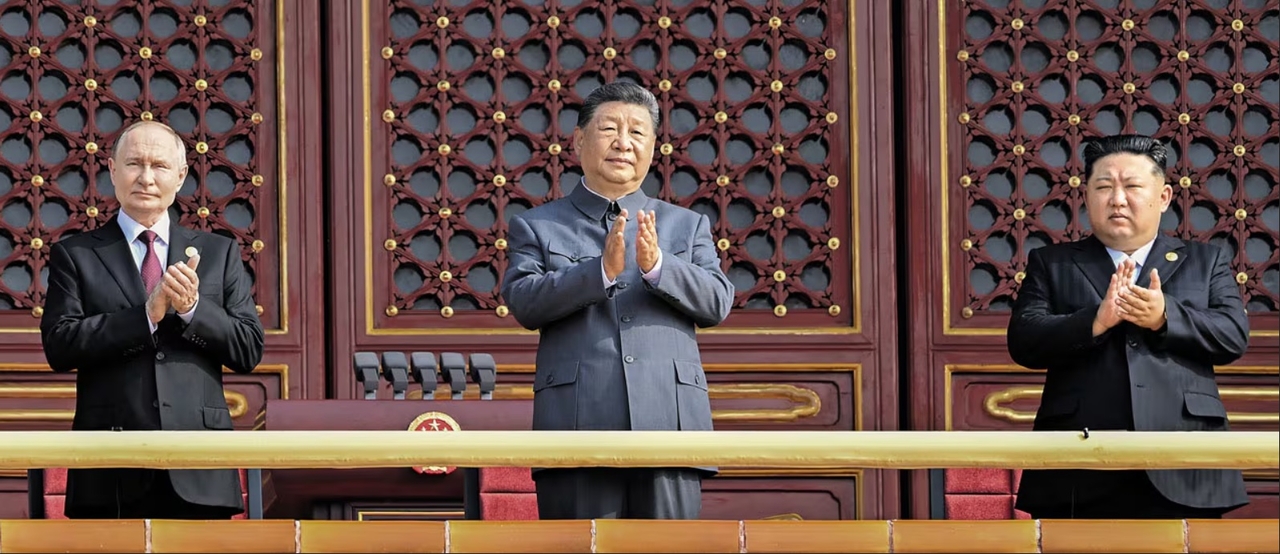 지난 9월 3일 중국의 80주년 전승절 열병식에 참석한 블라디미르 푸틴 러시아 대통령(왼쪽부터)과 시진핑 중국 국가주석, 김정은 북한 국무위원장이 행사를 텐안먼 망루에 올라 행사를 지켜보며 박수치고 있다. [로이터] |