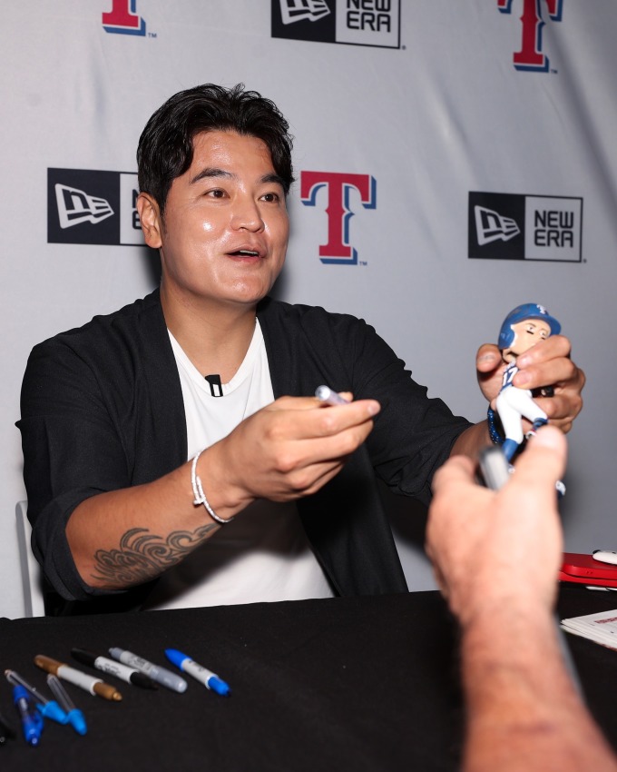 [서울=뉴스핌] 장환수 스포츠전문기자= 추신수가 8월 23일 텍사스 홈 경기에서 시구를 한 뒤 자신의 버블헤더를 갖고온 팬에게 사인을 해주고 있다. 텍사스는 추신수가 2014년부터 2020년까지 활약한 친정팀이다. [사진=텍사스] 2025.08.23 zangpabo@newspim.com |