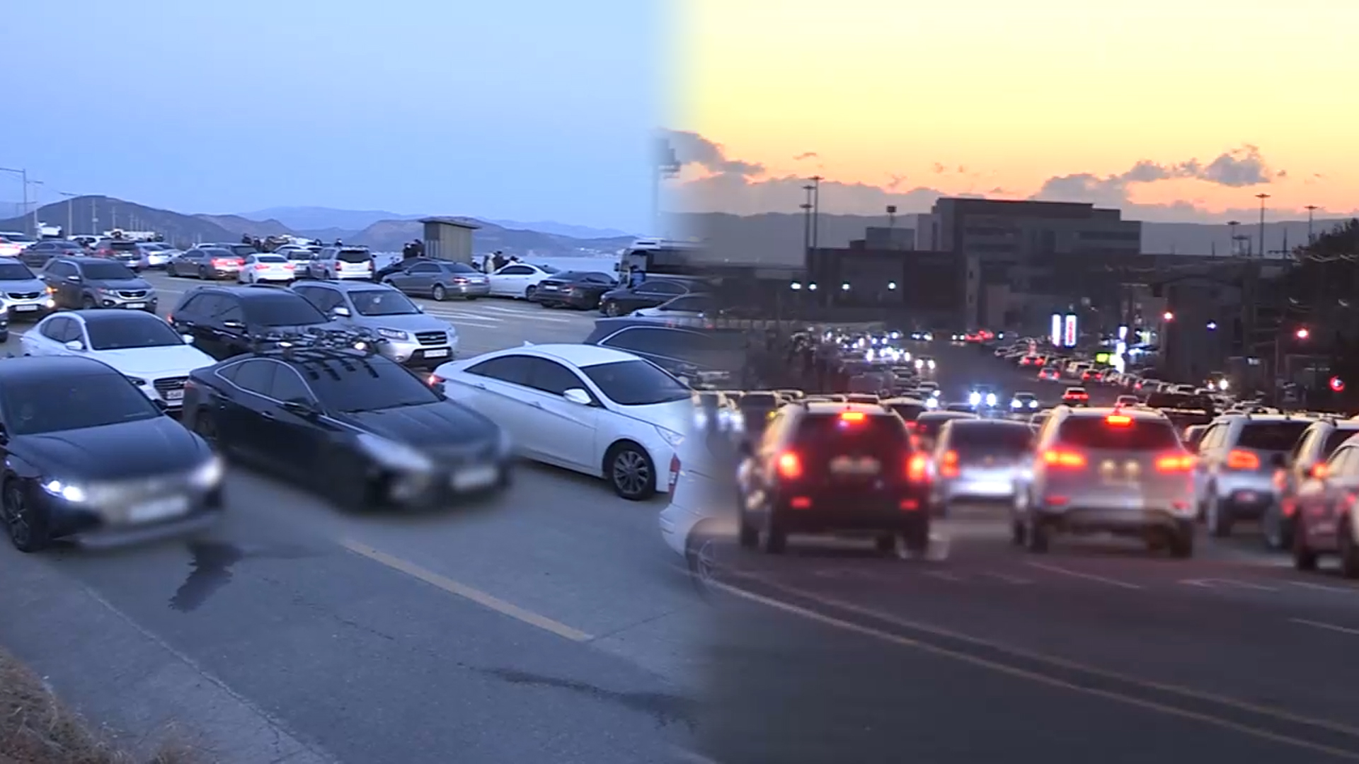 새해 첫 일출을 조금이라도 더 가까이서 보려는 차량 행렬이 꼬리에 꼬리를 물고 이어집니다.
