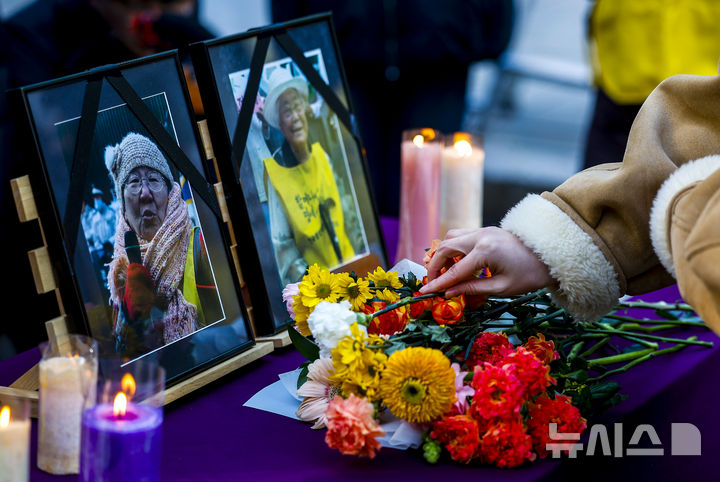 [서울=뉴시스] 정병혁 기자 = 31일 서울 종로구 옛 일본대사관 앞에서 열린 1733차 일본군성노예제 문제해결을 위한 수요시위에서 참석자들이 올 해 돌아가신 길원옥 할머니와 이옥선 할머니 사진에 헌화하고 있다. 2025.12.31. jhope@newsis.com |