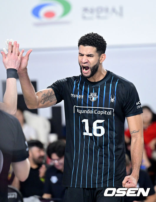 [OSEN=천안, 최규한 기자] 20일 오후 충남 천안 유관순체육관에서 ‘진에어 2025~2026 프로배구 V리그’ 남자부 현대캐피탈과 한국전력의 경기가 열렸다.홈팀 현대캐피탈은 4승 3패 승점 13, 방문팀 한국전력은 3승 4패 승점 8을 마크하고 있다.2세트, 현대캐피탈 레오가 득점에 기뻐하고 있다. 2025.11.20 / dreamer@osen.co.kr |