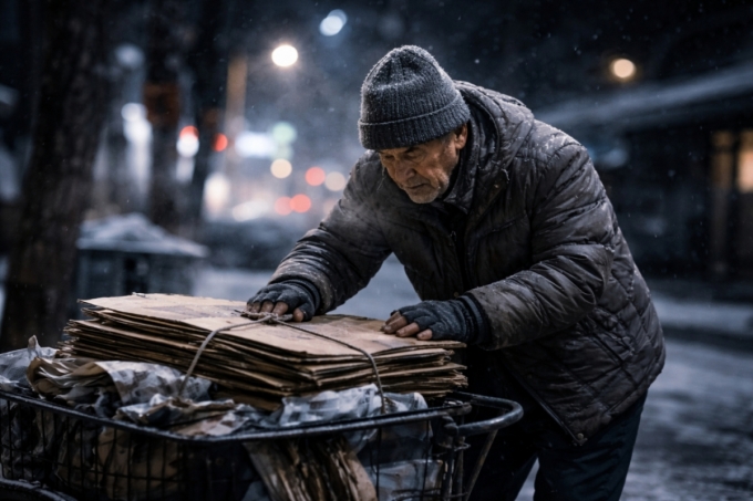 추운 날씨 속에서 폐지를 줍던 70대 노인이 길가에서 쓰러져 숨지는 사고가 발생했다. 사진은 기사 내용을 토대로 생성형AI(인공지능)를 활용해 만든 이미지./사진=오픈AI 챗GPT |