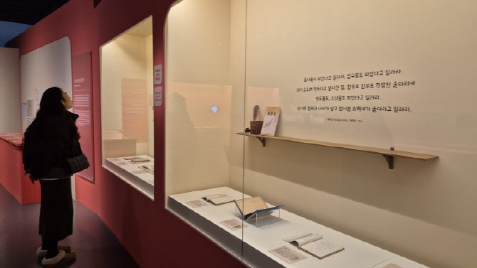 대한민국역사박물관 1945~1948 역사 되찾기, 다시 우리로 전에서 한 관람객이 '되찾은 말, 되찾은 삶'을 살펴보고 있다. (사진=손의연 기자) |