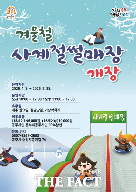 [더팩트ㅣ공주=김형중 기자] 충남 공주시가 2026년 겨울철 사계절썰매장을 오는 1월 3일부터 2월 28일까지 운영한다고 밝혔다.