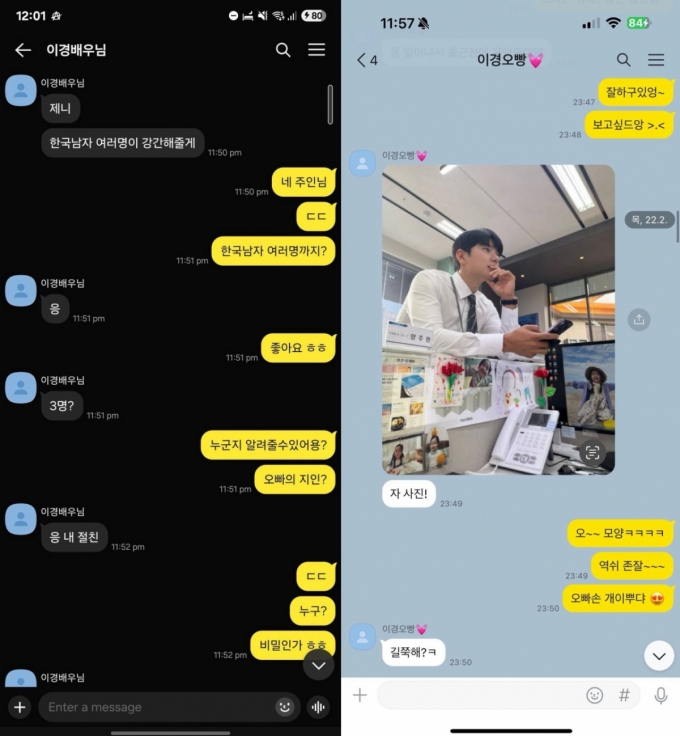 A씨는 이와 함께 이이경과 나눴다는 카카오톡 메시지와 이이경 추정 인물의 프로필 캡처 화면을 공개했다. 그는 "지인이라면 충분히 알아볼 수 있는 사진"이라며 "AI(인공지능)로 생성·조작한 이미지가 아니다"라고 강조했다.