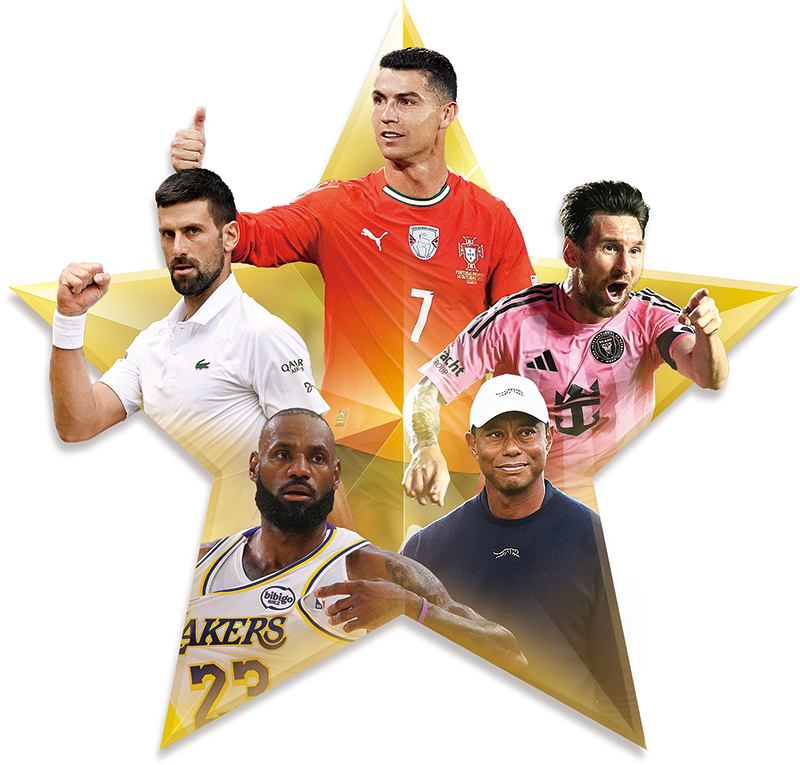 (위쪽부터) 호날두, 조코비치, 메시, 제임스, 우즈 |