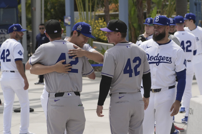 LA 다저스 오타니 쇼헤이가 지난 4월 16일(한국시각) 재키 로빈슨 데이를 맞아 상대팀 콜로라도 로키스 선수와 포옹을 하고 있다. AP연합뉴스 |