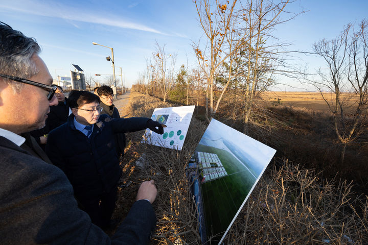 [서울=뉴시스] 조성우 기자 = 김성환 기후에너지환경부 장관이 31일 충남 당진시 대한제강 스마트팜 클러스터 구축 예정지를 찾아 철강 제조 과정에서 발생하는 폐열을 활용한 스마트팜 부지 조성 추진 상황을 점검하고 있다. (사진=기후에너지환경부 제공) 2025.12.31. photo@newsis.com *재판매 및 DB 금지