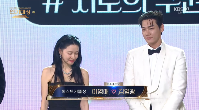 [OSEN=박근희 기자] '2025 KBS 연기대상’ 배우 이영애와 김영광이 드라마 '운수 좋은 날'을 통해 환상의 호흡을 인정받으며 베스트 커플상의 영예를 안았다.