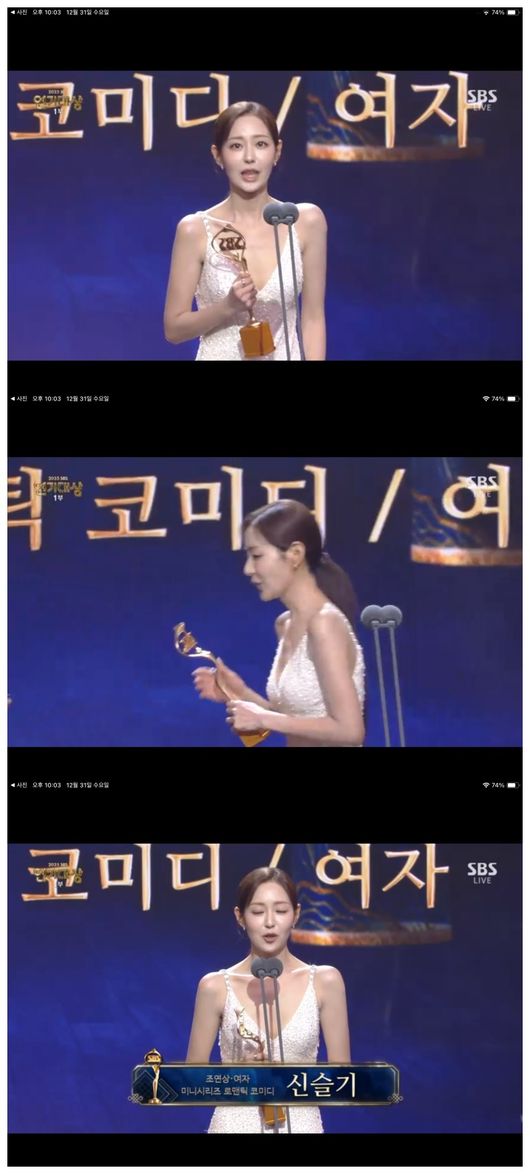 31일 오후 SBS 프리즘타워에서 열린 ‘2025 SBS 연기대상’에서는 '우쥬메리미'에서 조연으로 톡톡히 빛을 발한 배우 신슬기가 등장했다. 넷플릭스 '솔로지옥2'에서 히로인으로 많은 이의 호감을 샀던 그는 배우 전향을 선포해 모두를 의이하게 했다. 그러나 드라마 '피라미드 게임'에서 단호한 반장 역할을 맡았으며 '우쥬메리미'에서는 사랑에 차가운 얼굴로 뜨거운 눈물을 흘리는 여자가 되었다.