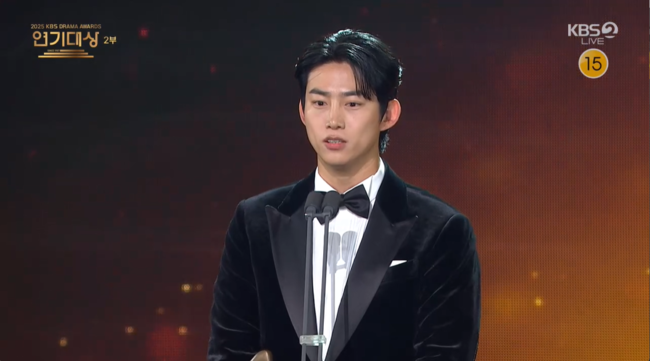 [OSEN=박근희 기자] '2025 KBS 연기대상’ 가수 겸 배우 옥택연이 생방송 도중 예비 신부의 실명을 당당히 외치며 역대급 '사랑꾼' 소감으로 시상식장을 뒤흔들었다.