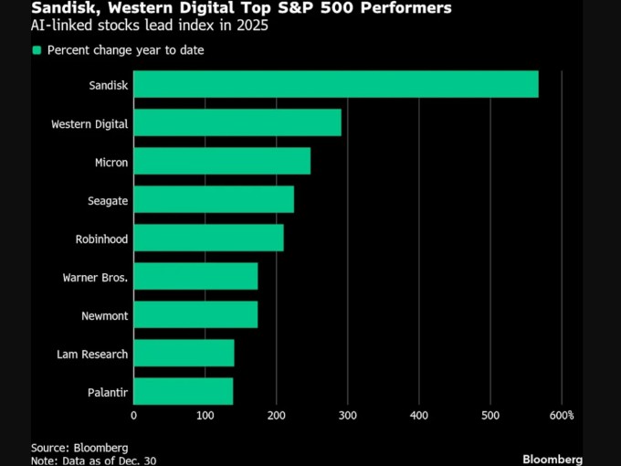 샌디스크, 웨스턴 디지털, 2025년 S&P 500 중 최고 수익률 기록 [자료=블룸버그] |