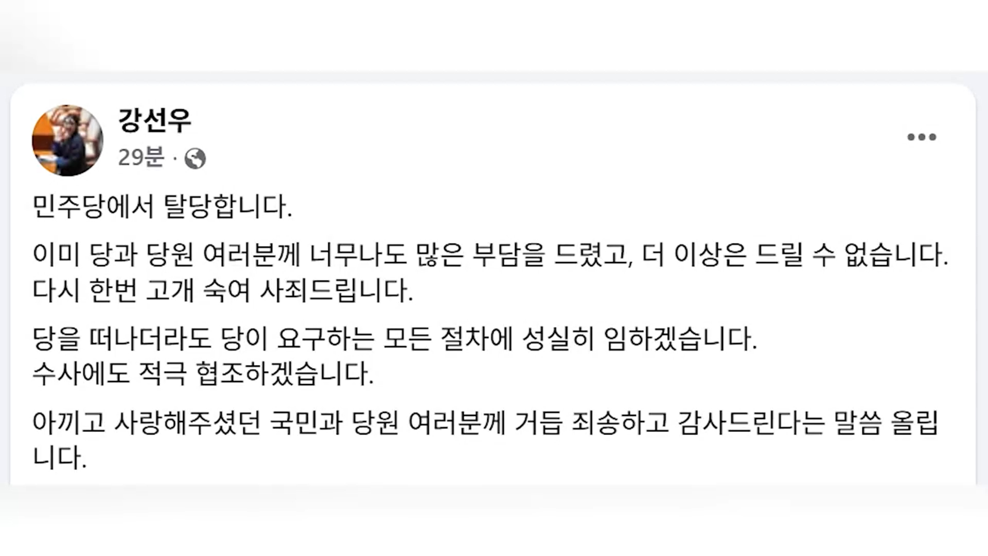 강 의원은 오늘(1일) 자신의 페이스북을 통해 "이미 당과 당원 여러분께 너무나도 많은 부담을 드렸고, 더 이상은 드릴 수 없다"며 "다시 한번 고개 숙여 사죄드린다"면서 이같이 밝혔습니다.