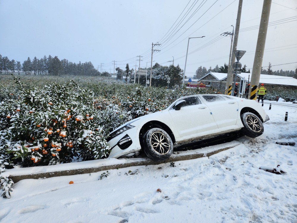 앞서 오전 8시 11분쯤 제주시 용담동 한 도로에서 눈길에 미끄러진 차량 2대가 부딪혀 1명이 병원으로 이송되는 등 현재까지 5건의 눈길 교통사고가 이어졌다.
