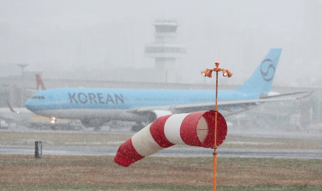 제주 지역에 대설 및 강풍 특보가 발효된 2일 오전 제주국제공항 활주로에 강한 눈보라가 일고 있다. 뉴시스 |