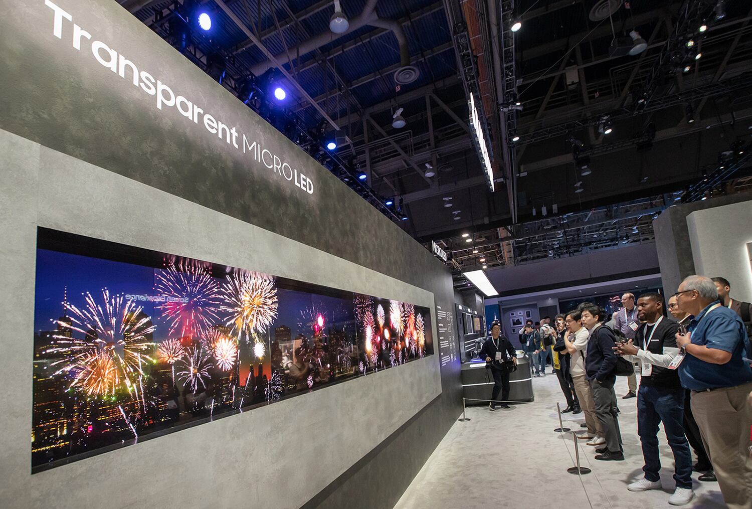 'CES 2024' 내 삼성전자 전시관에에서 관람객들이 투명 마이크로 LED를 바라보고 있다./삼성전자 제공 |