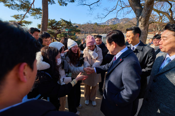 [서울=뉴시스] 청와대는 2일 이재명 대통령이 경복궁에서 오찬 후 산책하며 시민들과 인사 나누는 모습을 SNS에 공개했다. (사진=이재명 대통령 SNS) 2026.01.02. photo@newsis.com *재판매 및 DB 금지