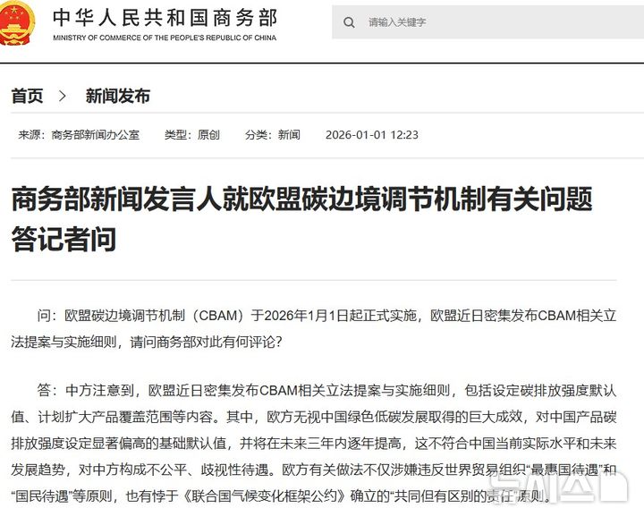 상무부는 "EU는 역사적 배출 책임, 국가 발전 단계, 기술 수준을 외면한 채, '탄소 누출 방지'라는 기후 명분을 내세워 새로운 무역보호주의를 추진하고, 자국의 탄소 기준을 개발도상국에 강요하고 있다"고도 주장했다.
