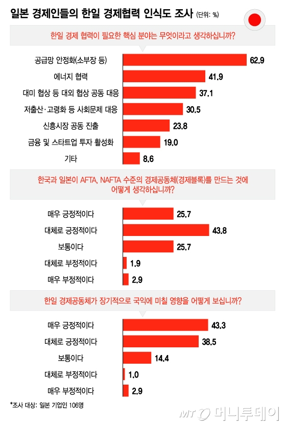 단순 협력을 넘어 '경제공동체' 단계로 나아가야 한다는 주장도 힘을 얻는다. 일본 경제인 69.5%는 AFTA(아세안 자유무역지대)나 NAFTA(북미자유무역협정) 수준의 한일 경제블록 형성에 동의했다. 글로벌 보호무역주의에 맞설 방패가 필요하다는 논리다.
