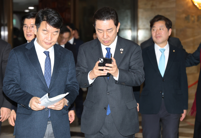 ▲더불어민주당 김병기 전 원내대표(가운데)가 30일 서울 국회에서 본회의를 마치고 나서고 있다. ⓒ연합뉴스 |