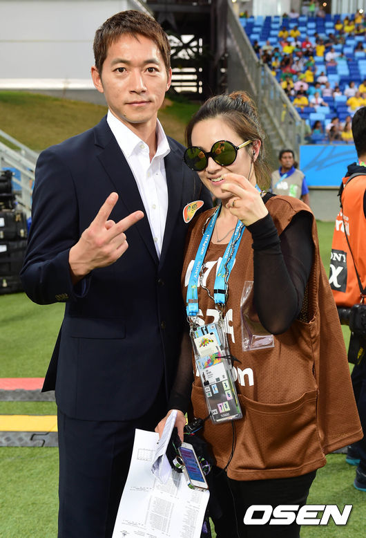 [OSEN=쿠이아바(브라질), 민경훈 기자] 18일(이하 한국시간) 브라질 쿠이아바 아레나 판타날에서 2014 브라질 월드컵 조별리그 H조 대한민국과 러시아의 경기가 열렸다.경기에 앞서 축구선수 김남일과 아내 김보민 아나운서가 취재진을 향해 포즈를 취하고 있다.홍명보 감독이 이끄는 대한민국은 최전방에 나선 박주영을 2선에서 구자철(마인츠)이 지원하고, 좌우 측면에서는 손흥민(레버쿠젠)과 이청용(볼튼)이 빠른 발을 내세운 침투를 할 예정이다. 수비형 미드필더에는 기성용(스완지 시티)과 한국영(가시와 레이솔)이 배치돼 공격과 수비의 연결고리 역할을 한다.포백라인에는 윤석영(퀸스 파크 레인저스)과 김영권(광저우 에버그란데), 홍정호(아우크스부르크), 이용(울산 현대)로 구성됐다. 홍정호는 지난달 튀니지전에서 당했던 발 부상으로 통증이 있지만 선발로 나섰다. 골키퍼 장갑은 정성룡(수원 삼성)이 차지했다.러시아전 결과에 따라 한국의 16강행이 결정된다고 해도 결코 과언은 아니다. 그만큼 첫 경기는 월드컵 전체의 분위기를 좌우할 수 있는 중요한 경기다./rumi@osen.co.kr |