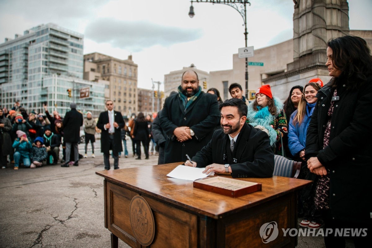 조란 맘다니 뉴욕시장이 2일(현지시간) 기자회견 도중 행정명령에 서명하고 있다. AP연합뉴스 |