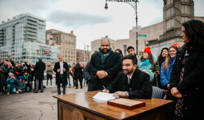 조란 맘다니 뉴욕시장이 2일(현지시간) 기자회견 도중 행정명령에 서명하고 있다.(사진 AP=연합뉴스) |