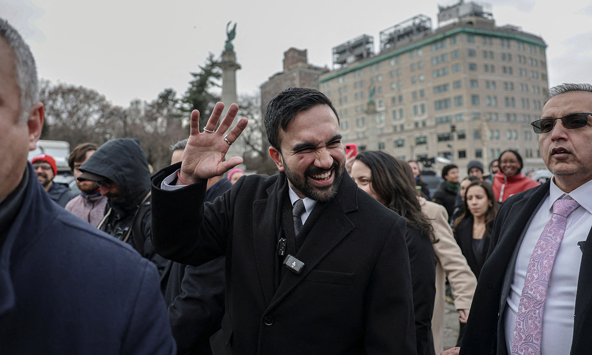 조란 맘다니 미국 뉴욕시장이 2일(현지시간) 기자회견을 위해 이동하는 도중 그를 환영하는 시민들에게 손을 흔들고 있다. 로이터연합뉴스 |