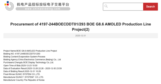 31일 중국 전자입찰 플랫폼 차이나비딩(ChinaBidding)에 따르면, 선익시스템은 BOE의 'G8.6 AMOLED Production Line Project' 증착 공정(Evaporation System-Process) 입찰에서 최종 낙찰자로 선정됐다. 해당 공시는 2025년 12월 31일자로 게시됐으며 발주처는 BOE 산하 Chengdu BOE Display Technology로 명시됐다.