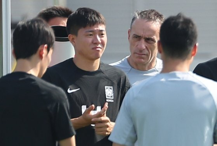지난 2022년 당시 훈련 도중 대표팀 동료들과 대화를 나누는 권창훈(사진 왼쪽에서 두 번째)과 파울루 벤투 감독(사진 왼쪽에서 세 번째). 연합뉴스 |
