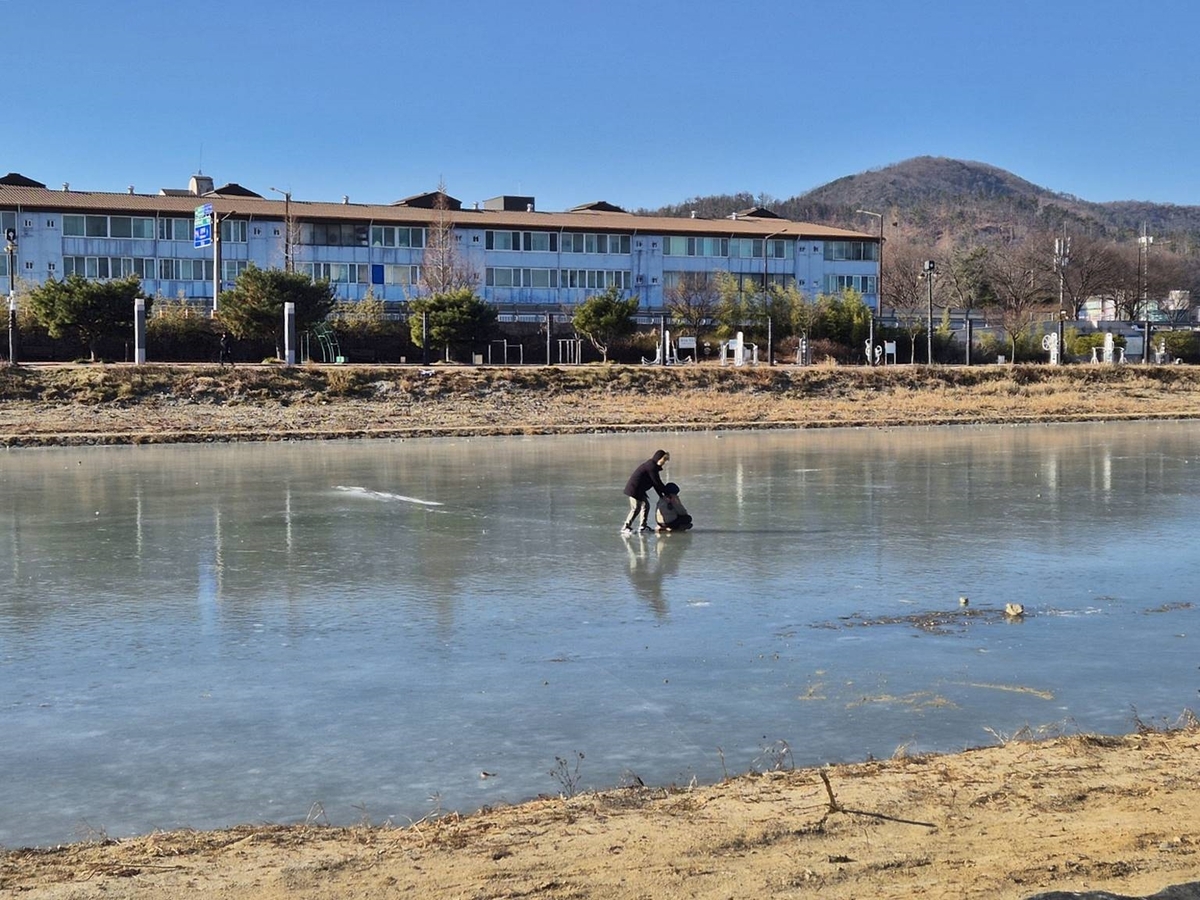 경주시 북천 하천 구간에서 얼음이 얼어붙은 가운데, 보호자와 함께 얼음 위에 진입한 어린이의 모습이 포착됐다. 경주시 제공 |
