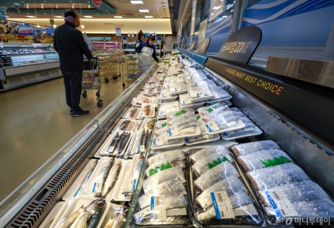 [서울=뉴시스] 정병혁 기자 = 4일 서울 서초구 하나로마트 양재점을 찾은 시민들이 고등어, 갈치 등 수산물을 살펴보고 있다. 고등어 가격이 상승세를 보이고 있다. 한국농수산식품유통공사 집계에 따르면 수입산 염장(대) 고등어 한 손 소매가격은 작년 12월 평균 1만363원으로 1만원을 넘어섰다. 이는 1개월 전(9828원)보다 500원 이상 올랐으며 전년 같은 기간(8048원)보다 2천원 넘게 상승한 금액이다. 고등어와 조기, 갈치 등이 두 자릿수 이상의 상승률을 기록하면서 12월 수산물 물가가 전년 같은 달보다 6.2% 상승했다. 2026.12.04. jhope@newsis.com /사진=정병혁 |