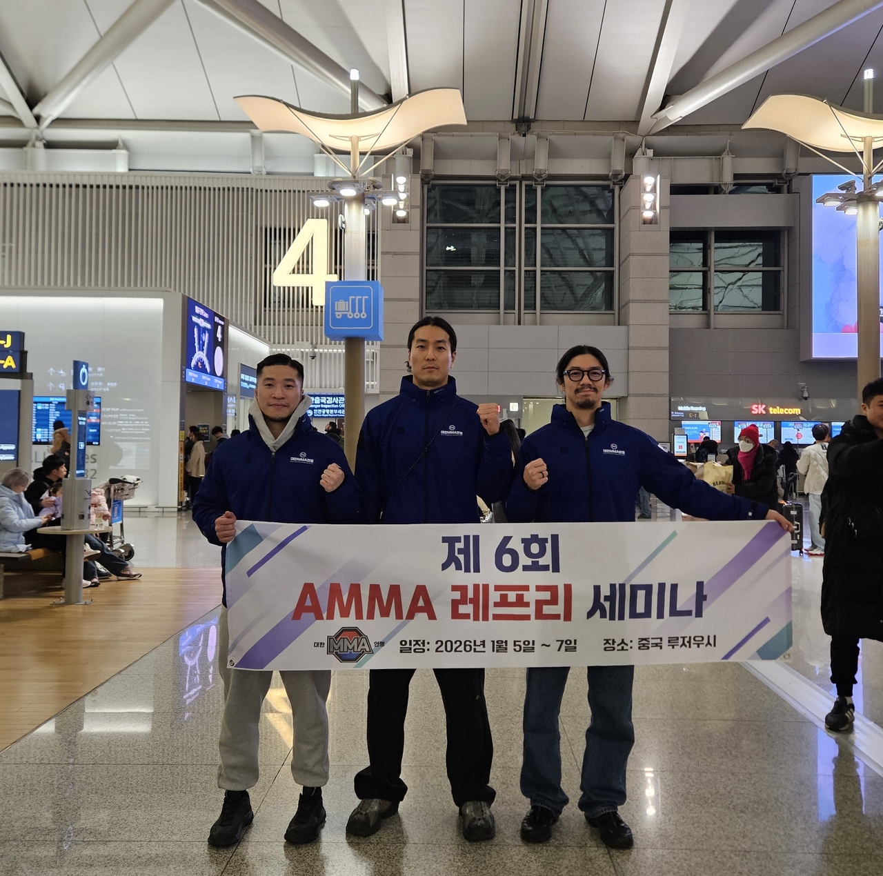AMMA 심판세미나 참가를 위해 중국으로 출국한 대한MMA연맹 심판단. 왼쪽부터 박승찬, 고영욱, 권세윤 심판 |