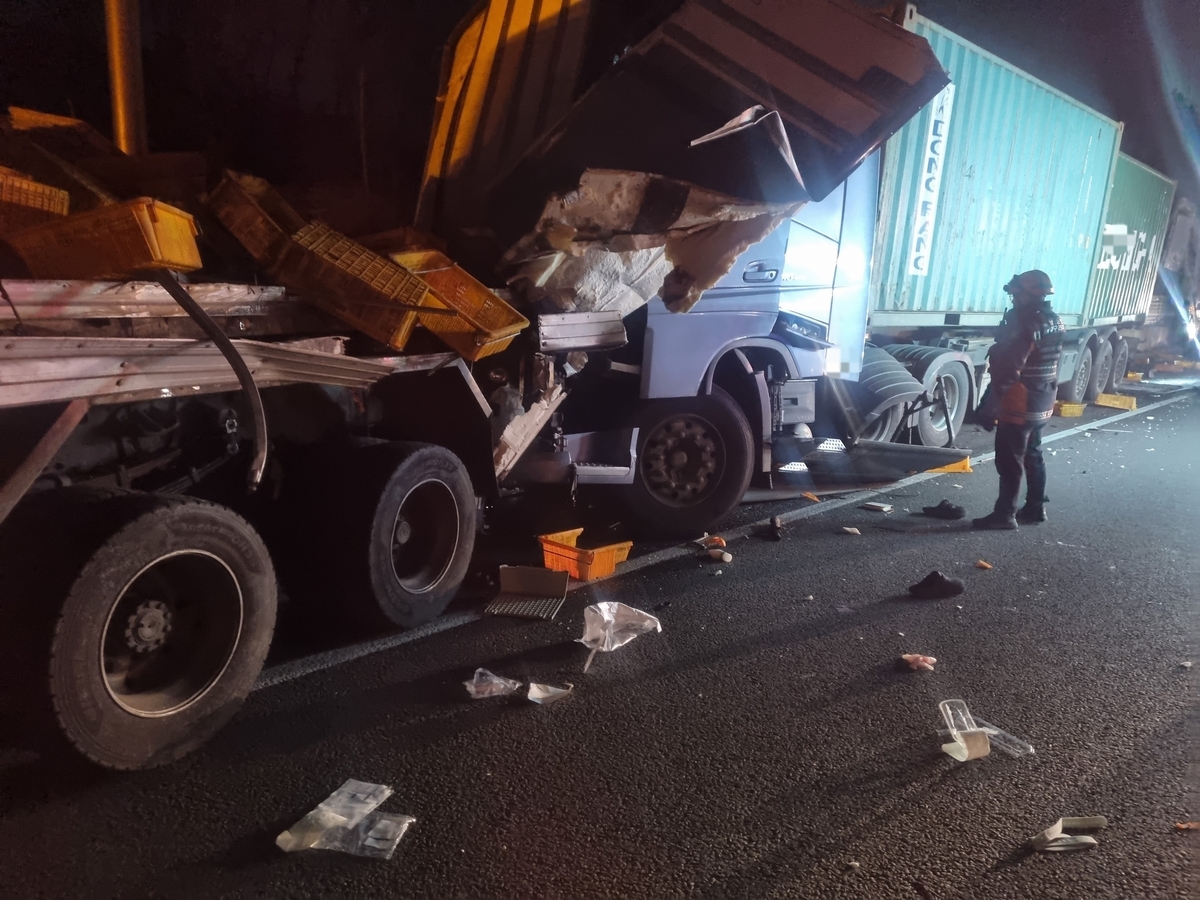 지난 4일 오후 9시쯤 경남 함안군 군북면 남해고속도로 함안고개 부근에서 전남 순천 방향으로 달리던 트레일러가 고장으로 갓길에 정차한 화물차를 들이받았다.