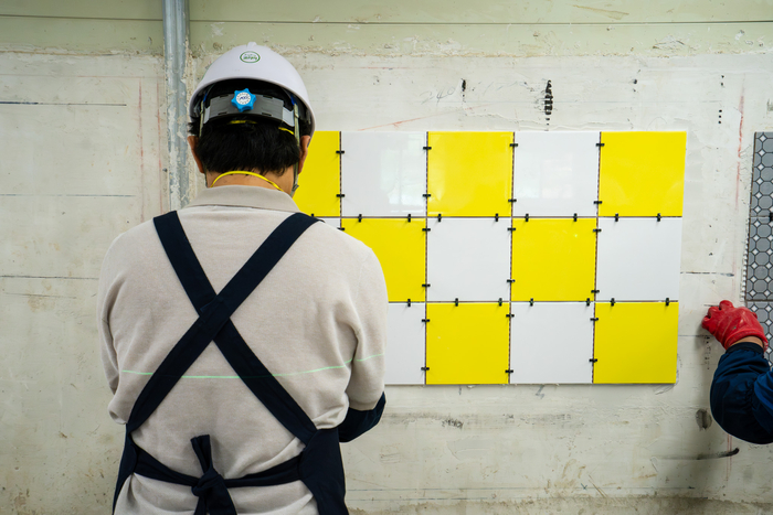 서울시 기술교육원 훈련생이 타일 시공 마감 실습을 진행하고 있다 |