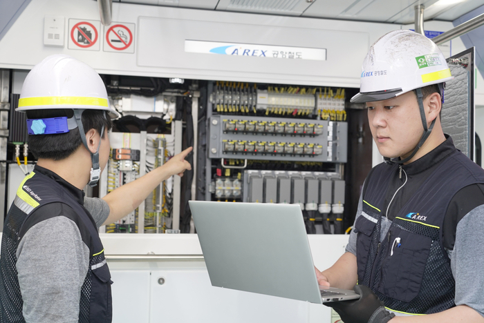 용유차량기지에서 공항철도 직원들이 5G 특화망에 연결된 노트북을 통해 객차 및 설비를 점검하는 모습. |