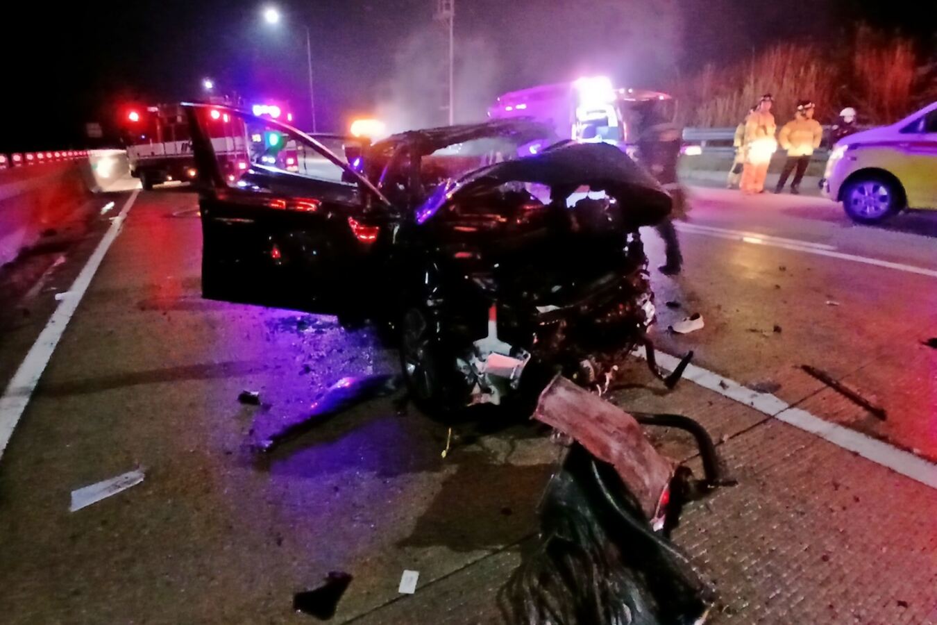 4일 오전 1시23분쯤 전북 고창군 고수면 우평리 서해안고속도로 상행선 73㎞ 지점에서 발생한 2차 교통사고로 차량이 크게 크게 파손돼 있다. 전북도소방본부 제공 |