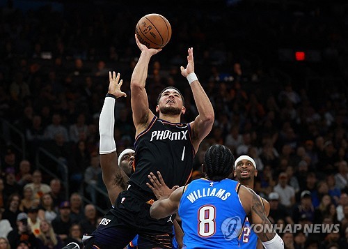 (서울=연합뉴스) 최송아 기자 = 미국프로농구(NBA) 피닉스 선스가 경기 막판 터진 '에이스' 데빈 부커의 극적인 3점포에 힘입어 디펜딩 챔피언이자 현재 리그 최고 승률 팀인 오클라호마시티 선더를 잡고 연승을 거뒀다.
