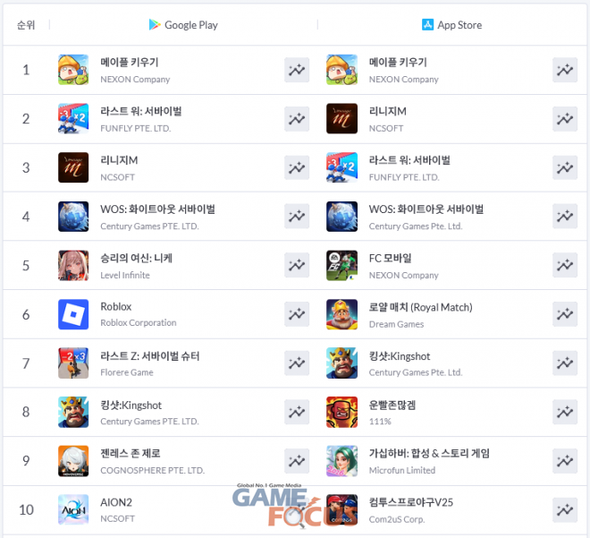먼저 iOS에서는 '메이플 키우기'의 독주 아래 '리니지M', '라스트 워: 서바이벌', '화이트아웃 서바이벌', 'FC 모바일'이 TOP 5를 형성하고 있다. '로얄 매치', '킹샷', '운빨존많겜', '가십하버', '컴투스프로야구V25' 등 캐주얼, 스포츠 게임들의 강세도 이어지고 있다.