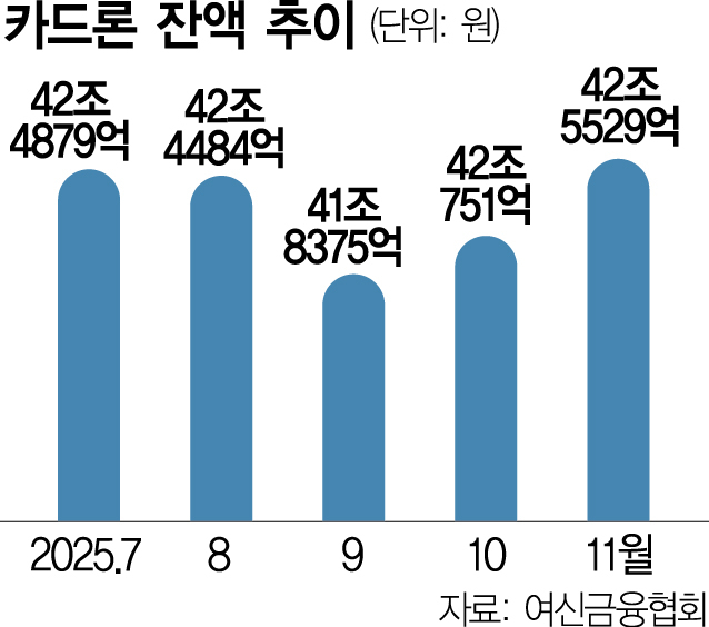 5일 여신금융협회에 따르면 9개 카드사(롯데·BC·삼성·신한·우리·하나·현대·KB국민·NH농협카드)의 지난해 11월 말 카드론 잔액은 42조 5529억 원으로, 전월 말(42조 751억 원)보다 1.14% 증가했다. 전월 대비 증가율은 2024년 10월(1.28%) 이후 1년여 만에 가장 높았다.