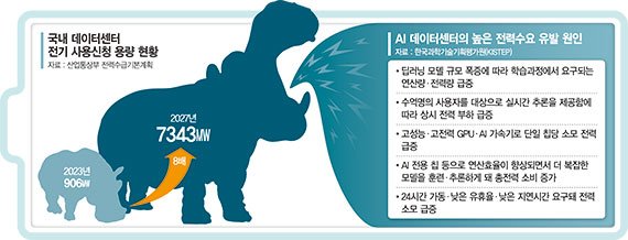 부동산 컨설팅 기업 쿠시맨앤웨이크필드 조사를 보면 10~25메가와트(㎿) 규모인 기존 데이터센터와 달리 AI 데이터센터는 단일 부지에서만 200~400㎿의 전력이 요구된다. 일반 산업시설 대비 단위 면적당 에너지 소비량은 50배 이상에 달한다. 특히 생성형 AI를 넘어 스스로 목표를 설정하고 계획을 수립해 기존 거대언어모델(LLM)보다 수십배 이상의 연산이 필요한 에이전틱 AI 등 AI 모델의 급격한 발전에 발맞춰 데이터센터 전력 소비량이 폭증할 것이란 전망이 나온다.