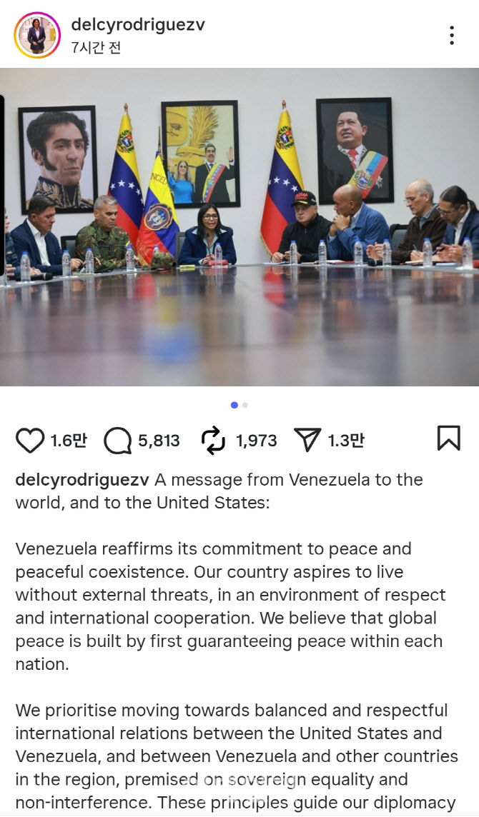 로드리게스 대통령 권한대행은 4일(현지시간) 인스타그램에 올린 영문 성명에서 “미국 정부가 국제법 틀 안에서 공동 발전을 목표로 하는 협력 의제에 함께할 것을 초청한다”고 밝혔다.
