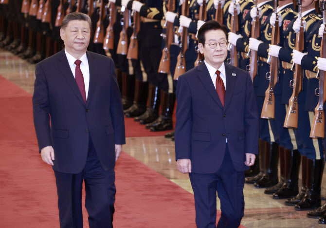 이재명 대통령과 시진핑 중국 국가주석이 5일 베이징 인민대회당에서 열린 이 대통령 공식환영식에서 의장대를 사열하고 있다. (사진=연합뉴스) |