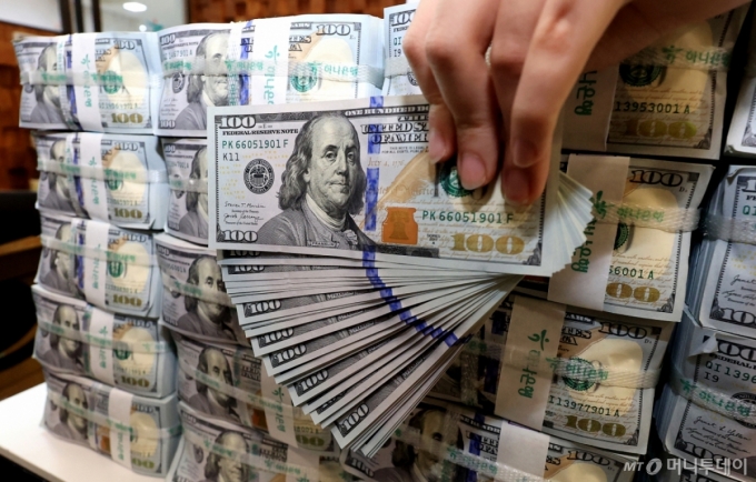 서울 중구 하나은행 위변조대응센터에서 은행 관계자가 달러화를 정리하는 모습. /사진=뉴스1 |
