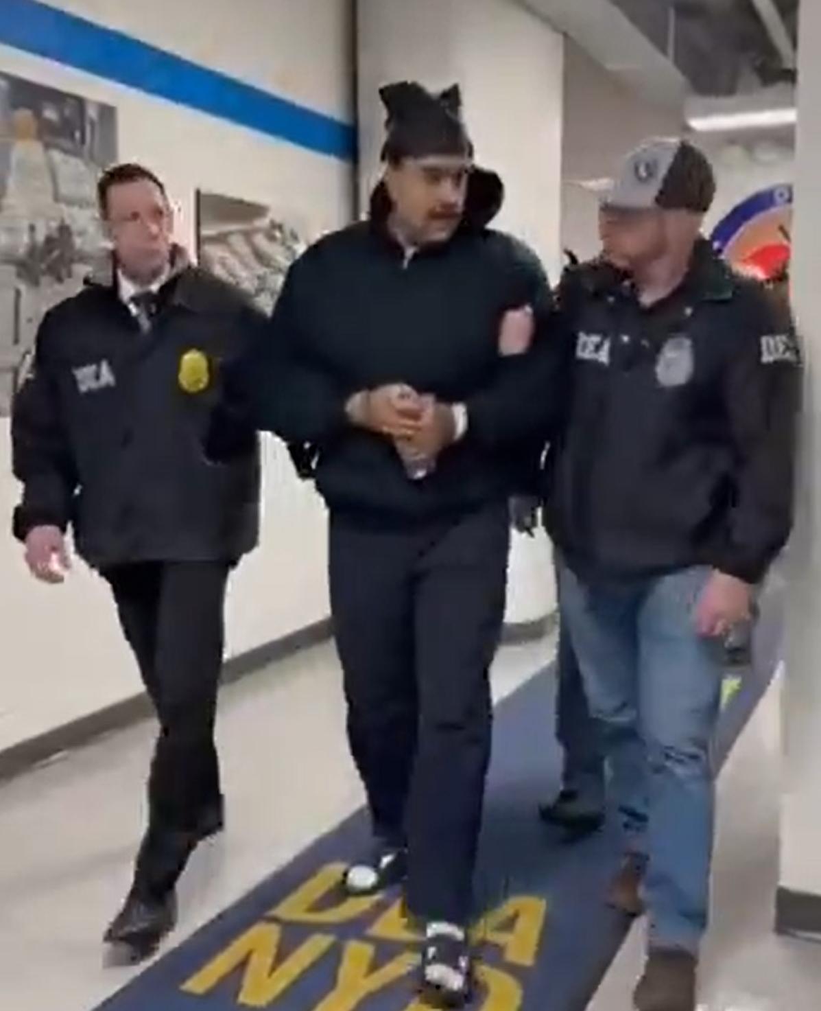 마약단속국 뉴욕지부 압송된 마두로. 3일(현지 시간) 니콜라스 마두로 베네수엘라 대통령(가운데)이 미국 뉴욕의 마약단속국(DEA) 뉴욕지부에서 수갑을 찬 채 요원들에게 둘러싸여 걸어가고 있다. 사진 출처 미국 백악관 X 계정 |