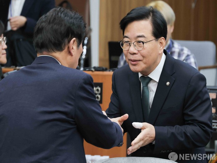 [서울=뉴스핌] 윤창빈 기자 = 송언석 국민의힘 원내대표가 6일 서울 여의도 국회에서 열린 원내대책회의에서 인사를 나누고 있다. 2026.01.06 pangbin@newspim.com |